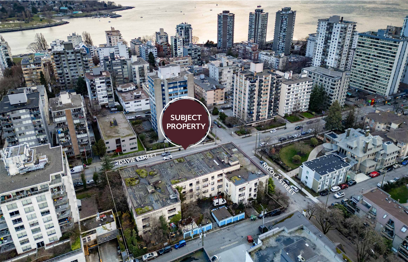 Currently improved with a three-storey, 51-unit rental apartment building constructed in 1946—less than half of which are currently occupied—the site presents a significant redevelopment opportunity. It is situated in the Lower Davie District of the West End Community Plan, which supports high-rise residential development and encourages a vibrant mix of residential and commercial uses.